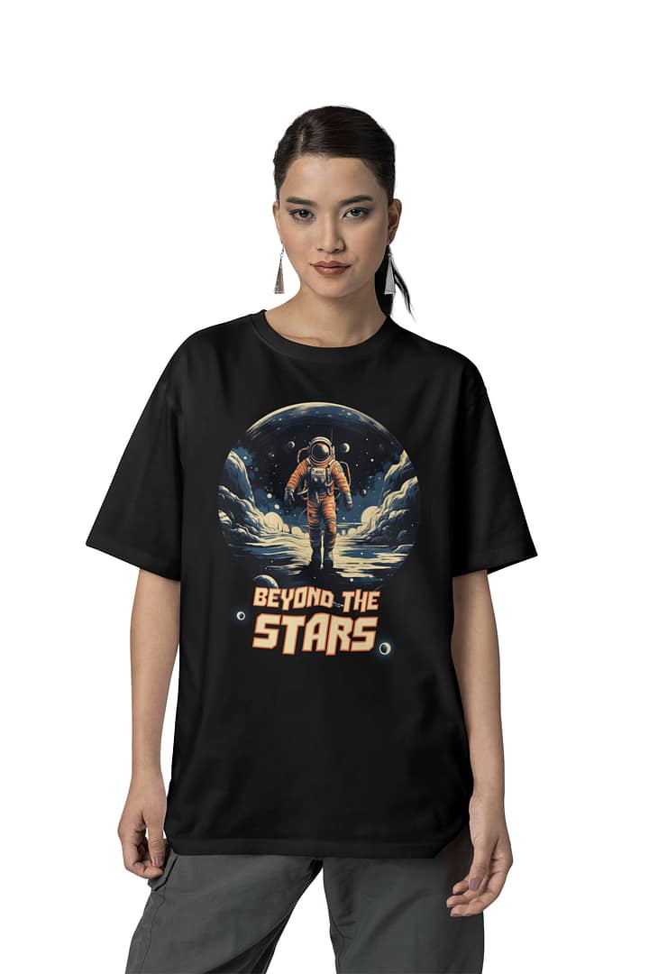 Embrace the vastness of the universe with our oversized “Beyond the Stars” T-shirt. The dreamy cosmic illustration adds a futuristic edge to your wardrobe while keeping you comfortable all day long.