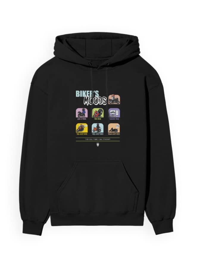 Bring fun and attitude to your ride with the “BIKER’S MOODS” Pullover Hoodie. Featuring playful cartoon-style biker characters expressing different moods in vibrant multi-colored boxes, this design is inspired by nostalgic animated shows and rider emotions alike. It’s bold, humorous, and a must-have for riders with a personality-packed throttle hand.