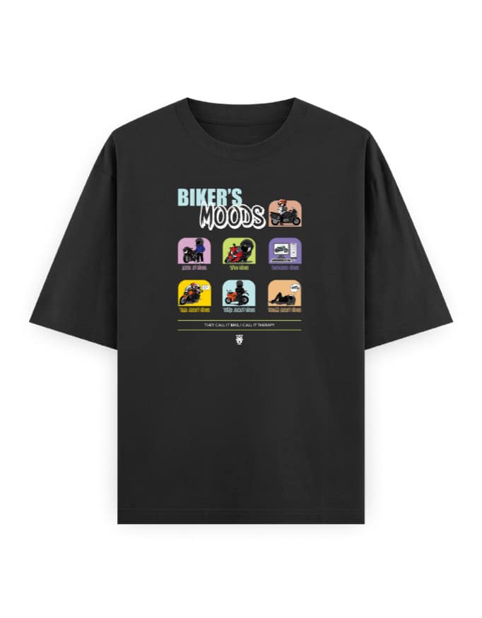 For those who like to stand out, the “Biker’s Moods” oversized tee is a bold expression of biker life through colorful cartoon characters. The multi-colored box design brings nostalgia from cartoon shows while capturing the thrill and moods of a rider.
