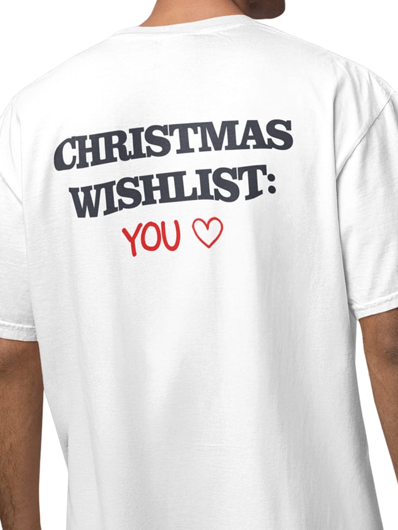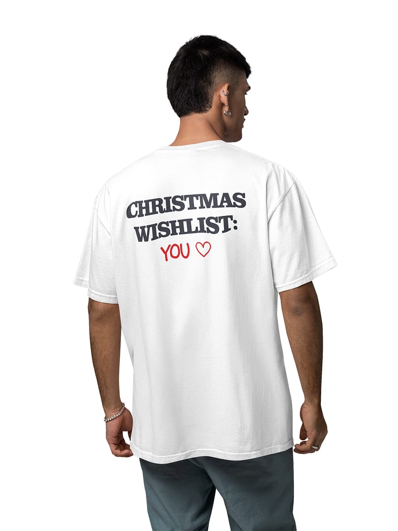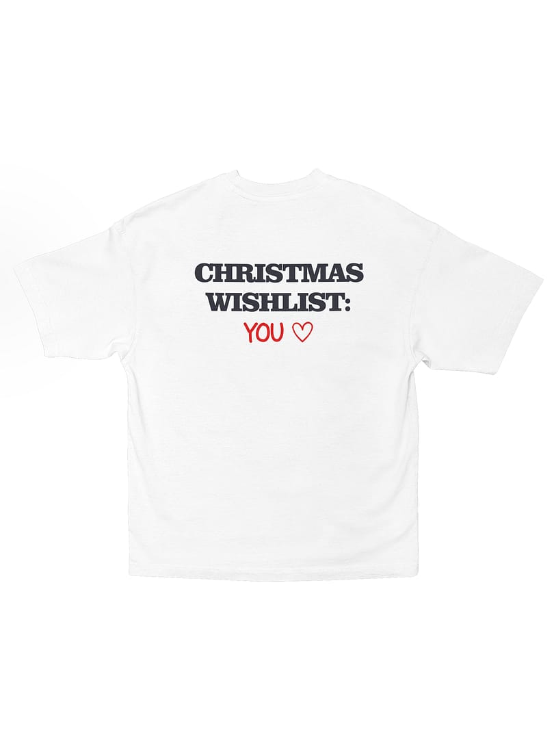 Spread festive charm with the “CHRISTMAS WISHLIST: YOU” Oversize T-Shirt. The playful back print pairs bold black lettering with a handwritten red YOU ♥, creating a warm, romantic Christmas vibe. Cute, cheeky, and perfect for gifting—or wearing around that special someone.