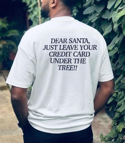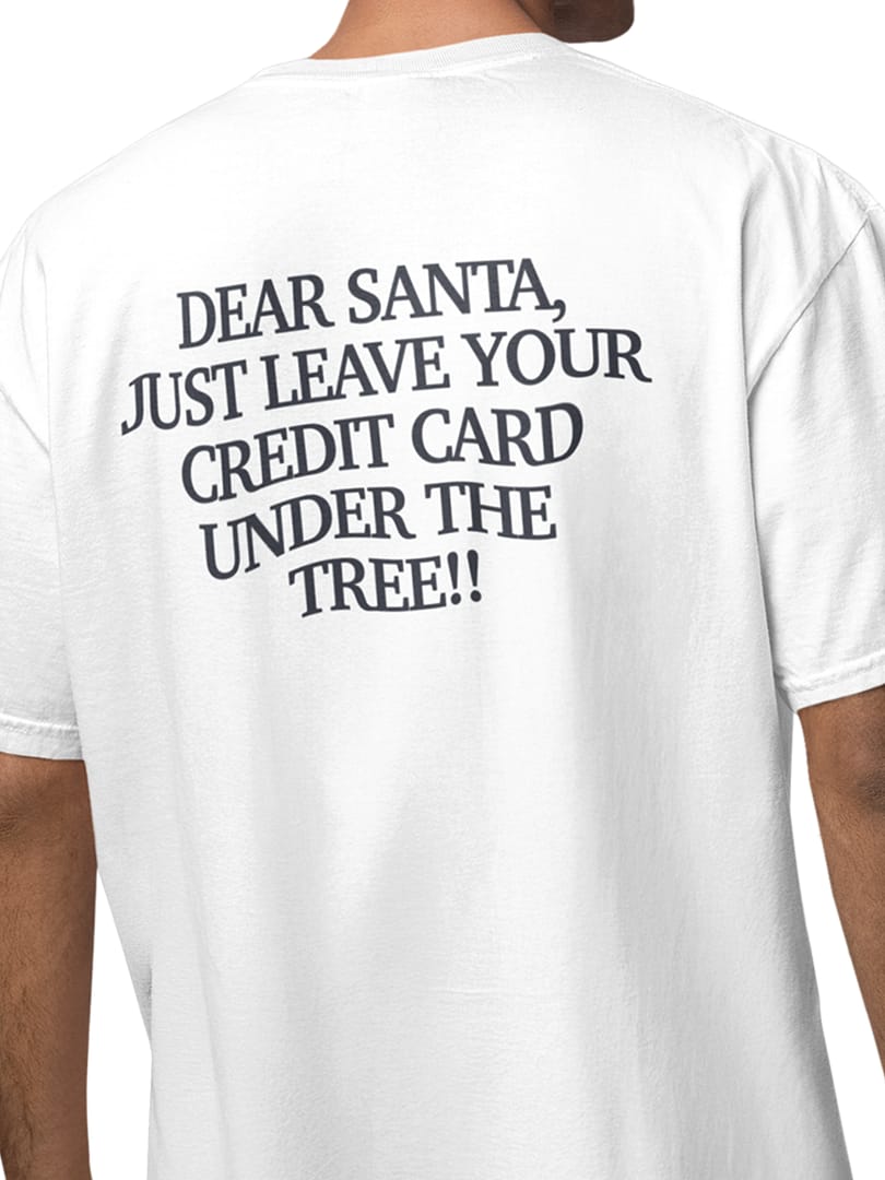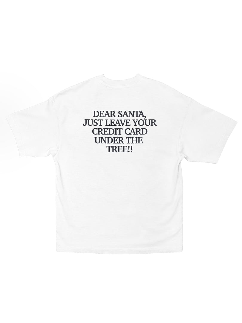 Keep the holiday humor clean and timeless with the “DEAR SANTA (Classic Text)” Oversize T-Shirt. Featuring a bold serif-style back print—DEAR SANTA, JUST LEAVE YOUR CREDIT CARD UNDER THE TREE!!—this tee mixes festive mischief with a more refined, minimal typeface. Sleek, playful, and perfect for Christmas season styling.