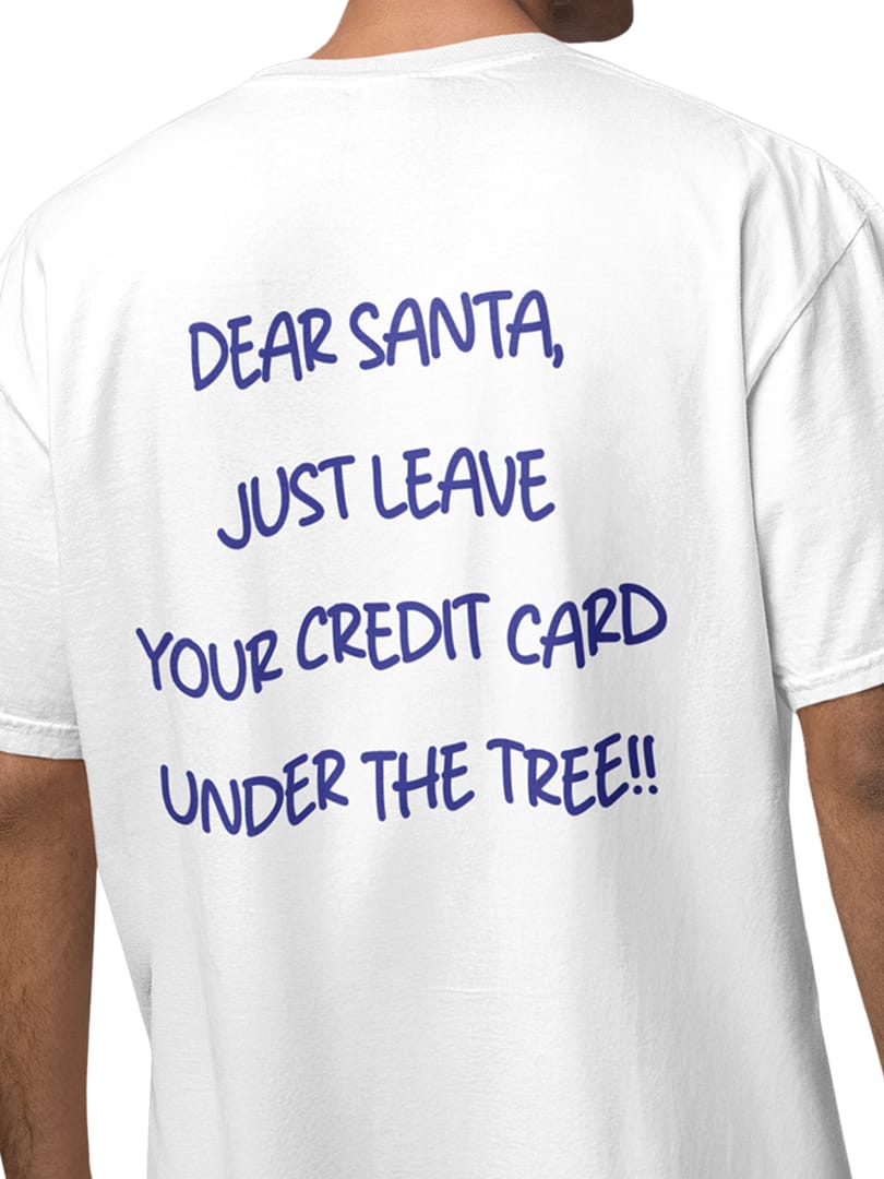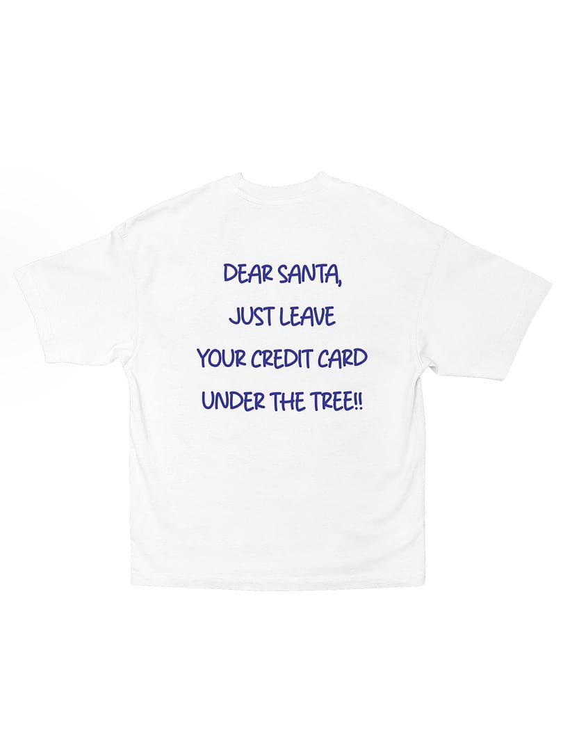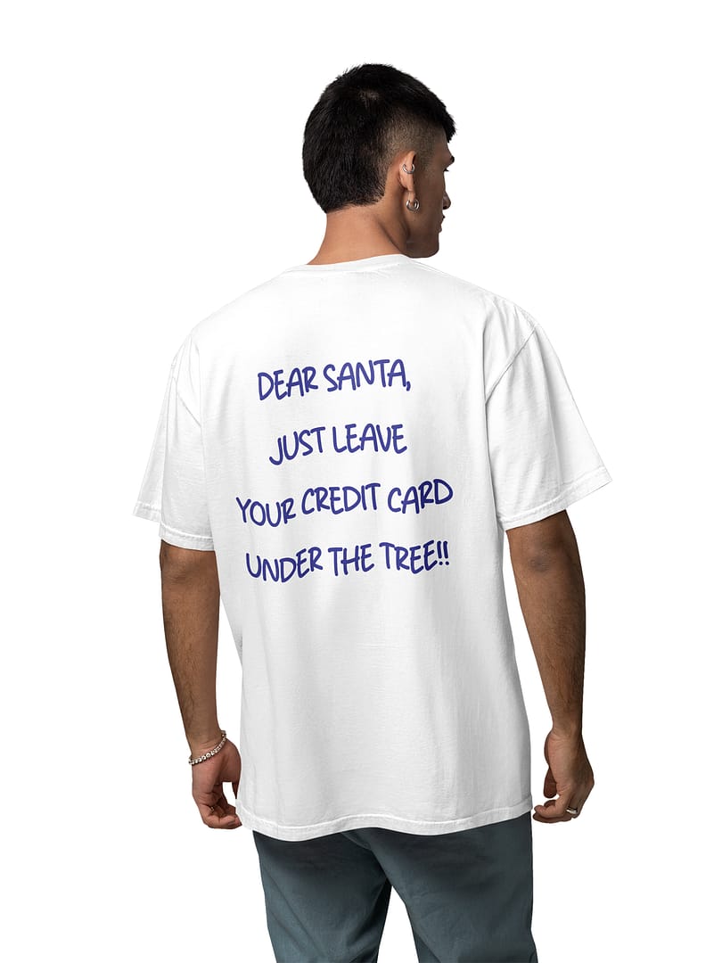 Bring humor to the holidays with the “DEAR SANTA” Oversize T-Shirt. The playful back print—DEAR SANTA, JUST LEAVE YOUR CREDIT CARD UNDER THE TREE!!—delivers cheeky Christmas energy in bold blue lettering. Lighthearted, festive, and perfect for anyone who loves a little seasonal mischief.