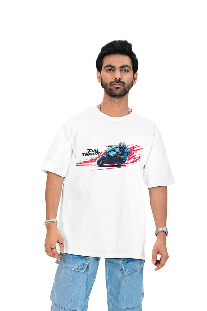 Step into high-velocity style with the “FULL THROTTLE” men’s oversized T-shirt. The bold sky blue bike and red-white speed sparks race across the chest, making this the ultimate gear for adrenaline lovers. Oversized, unapologetic, and ready for the open road.