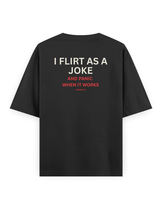 “I Flirt As A Joke And Panic When It Works” Unisex Black Oversized Graphic T-Shirt