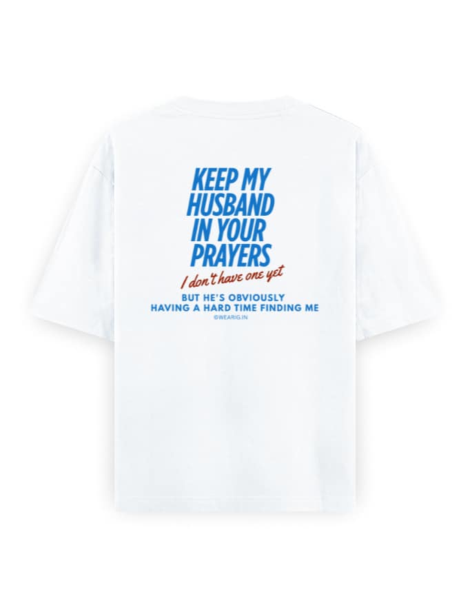 “Keep My Husband in Your Prayers, I Don’t Have One Yet But He’s Obviously Having a Hard Time Finding Me” Unisex Oversized Graphic T-Shirt
