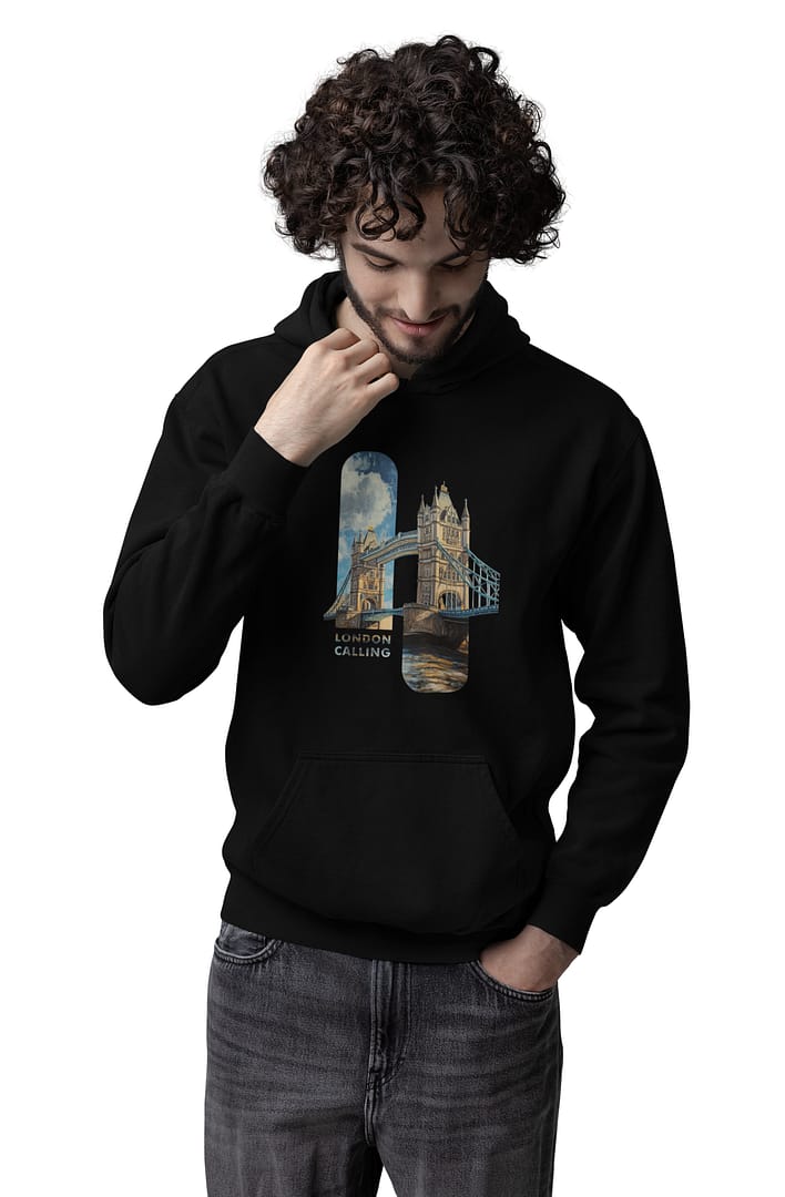 Travel through style with the “London Calling” Pullover Hoodie, showcasing a digitally printed oil-painted graphic of London Bridge. This hoodie is a celebration of art and wanderlust, perfect for men who appreciate unique designs.