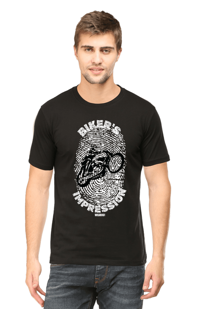 Make a lasting impression with our unique “Biker’s Impression” T-Shirt. This one-of-a-kind design features a striking thumbprint graphic intertwined with a dynamic vector of a biker, symbolizing the indelible mark every rider leaves on the world. The powerful quote, “Biker’s Impression,” boldly displayed across the front, serves as a reminder of the freedom and individuality that defines every rider.