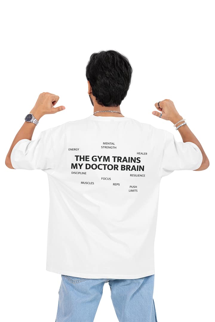 Hit the gym or the hospital in style with the “THE GYM TRAINS, MY DOCTOR BRAIN” Oversize T-Shirt—a bold statement for doctors who know the importance of both mental and physical strength.