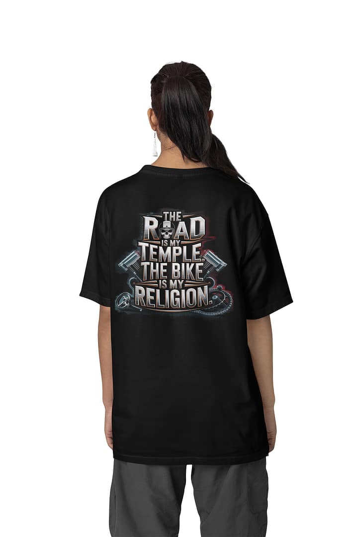 Make a bold statement in the “THE ROAD IS MY TEMPLE, THE BIKE IS MY RELIGION” Women’s Oversized T-Shirt. This 240 GSM heavyweight tee combines relaxed style with a metallic biker-inspired graphic.