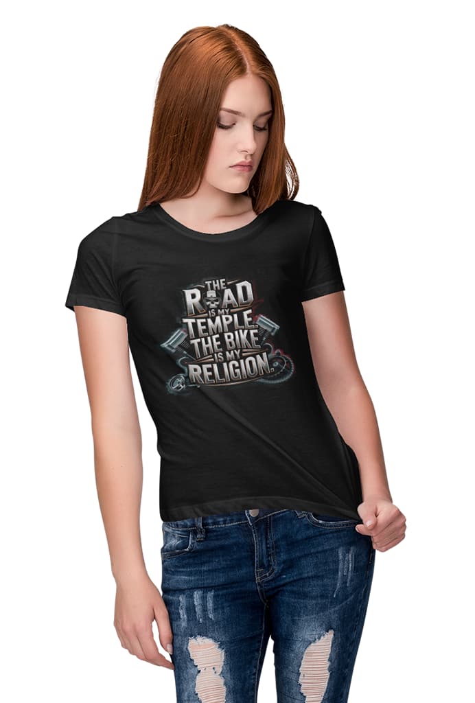Celebrate your passion for the road with the “THE ROAD IS MY TEMPLE, THE BIKE IS MY RELIGION” Women’s Graphic T-Shirt. Crafted from soft 180 GSM cotton, this tee features a bold metallic text graphic and bike engine elements in the background.